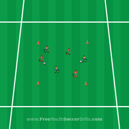 This is a drill well suited to allow your players to practice their passing, their touch and dribbling and also their understanding for spacial awareness.