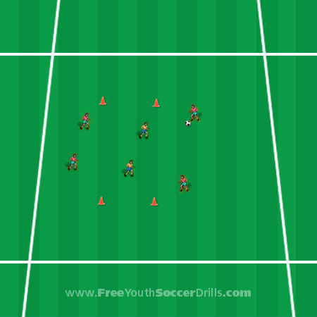 This drill is also very good practice for the defending players. They should try not to allow a gap to appear through to the other side and work together to close the ball down.