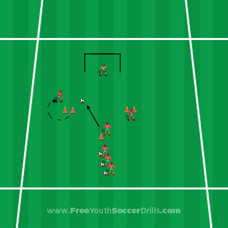 Take a look at the diagram below. You will need a few cones (3 minimum), some soccer balls and a goal.